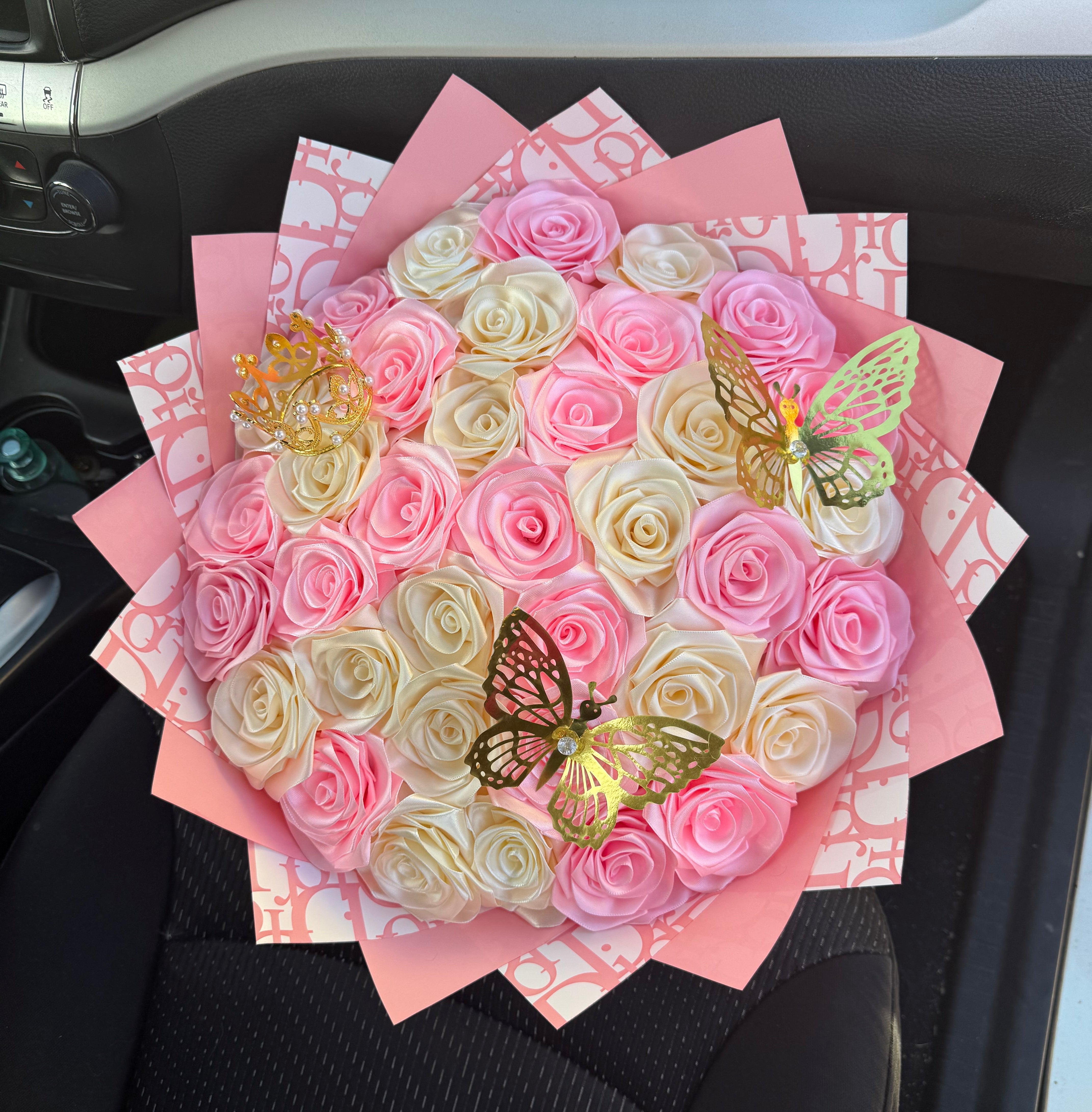 Made with care and unconditionally loved by our customers, this signature bestseller exceeds all expectations. Features 36 handmade ribbon roses, two butterflies, and a mini crown.